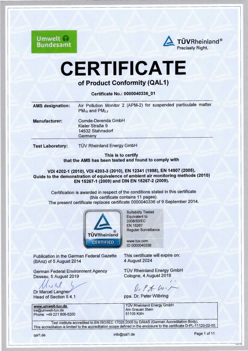 今年8月, 康姆德潤達(dá)便攜式顆粒物在線監(jiān)測儀APM-2獲最新TüV 認(rèn)證。