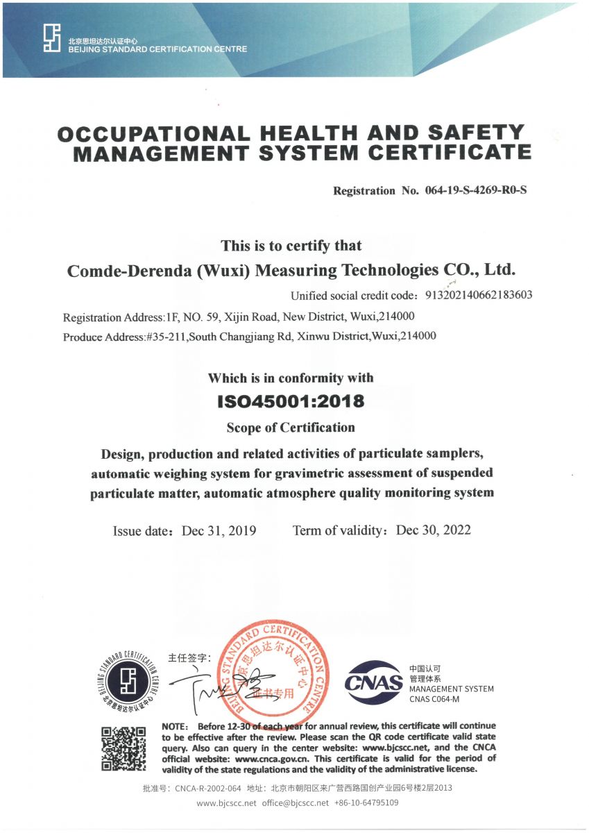 2019年12月31日,康姆德潤達(無錫)測量技術(shù)有限公司正式獲得ISO45001:2018職業(yè)健康安全管理體系認(rèn)證,這標(biāo)志著我公司在職業(yè)健康安全管理上緊貼國際先進管理模式,為公司后續(xù)的安全穩(wěn)定及可持續(xù)發(fā)展提供了強有力的保障。