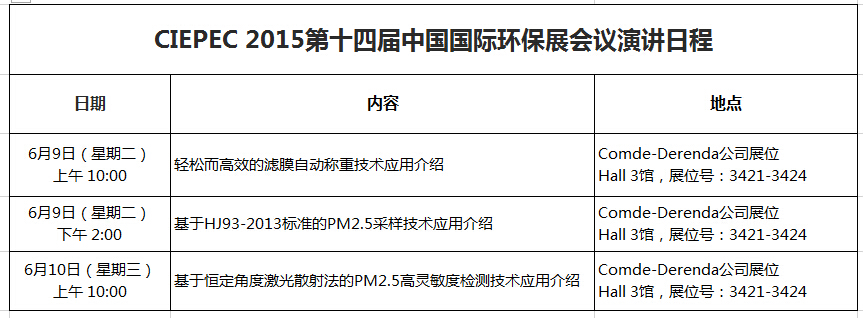 康姆德潤(rùn)達(dá)公司 將于2015年6月9日至12日參加北京·中國(guó)國(guó)際展覽中心舉辦的第十四屆中國(guó)國(guó)際環(huán)保展覽會(huì)(CIEPEC 2015),Hall3館,展位號(hào):3421-3424。此外,展會(huì)期間將同期舉行核心技術(shù)應(yīng)用演講,安排日程如下: